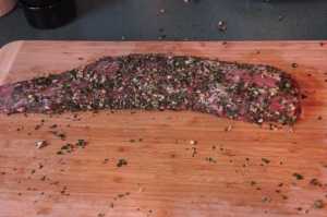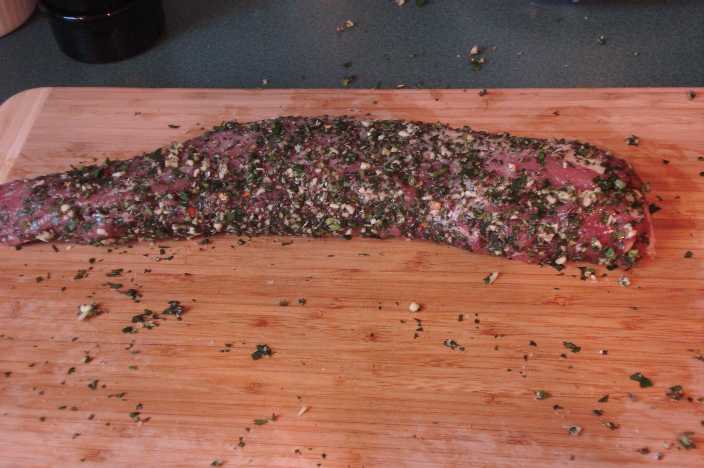 2nd: Once meat is trimmed and primed, roll it around on the chopping board coating all sides in a salty, peppery herby crust. No oil need be added.