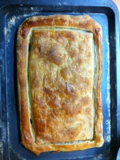 6th: Score an edge into the rolled pastry and eggwash. Pierce the centre before placing into a hot oven for 20mins.