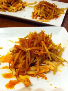 This was a winning dish!  Galicia’s signature dish served as if taken out of a Japanese cookbook.  The octopus served in thin strips with thin chips (fried in oil!) and mixed with the characteristic pimienton of Pulpo a la Gallega.