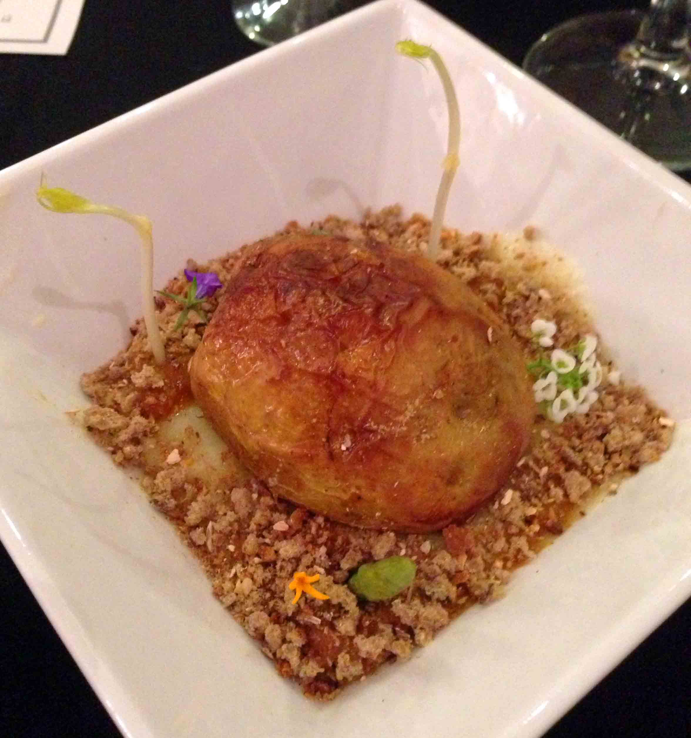 A solitary potato growing in soil with asparagus and flowers growing out of the soil. The only thing this dish needed was Spring’s blue sky and sunshine!
