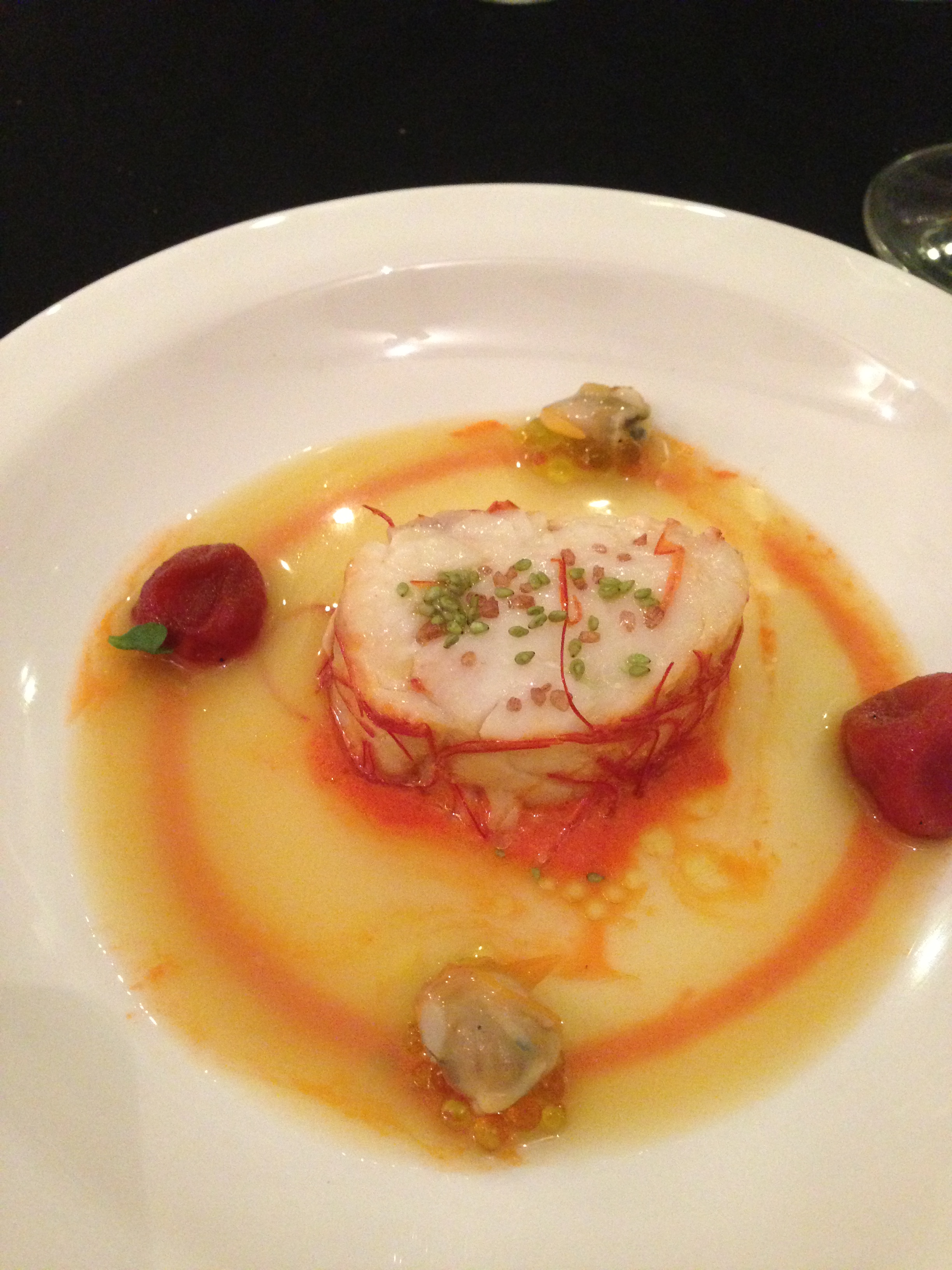 This was another visual treat as well as a beautifully flavoured dish. The hake, meaty in texture was well supported by the red curry. Its flavour was just there and even the wimpiest of spice eaters could have managed this very delicate balance of flavours. The soya air and the olive oil caviar which having researched this was another of Chef Adrià’s innovations, giving the dish texture.
