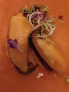 Following this was a delicious light gazpacho which we felt was more like a salmorejo as it was so smooth and silky. Poured over the sea scented meat of some juicy muscles, gently sprinkled by some micro herbs for a crunchy, floral back note to the gazpacho. A delicate dish. The only thing that annoyed me was that the square bowls it was served in made it difficult to scoop any dregs of gazpacho left behind!