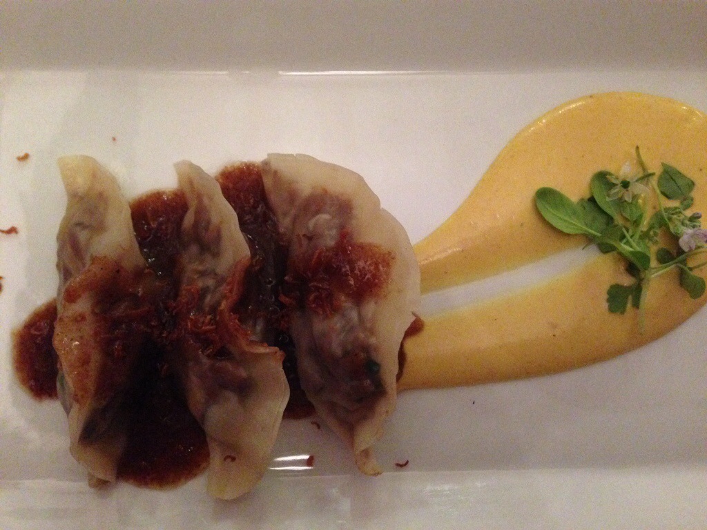 The last of the savoury dishes was an oxtail and shiitake empanadilla served on a wave of creamed ras-el-hanout potatoes. The aromatic spices in the potatoes working beautifully with richness of the oxtail and shiitake mushrooms. The empanadillas had been steamed which is traditional when using this type of pastry for dim-sum, however, as the potatoes were creamed I felt the textures here were too similar; the dish needed an extra texture and perhaps either deep frying them or even cooking them as Japanese gyoza (first fried in a pan until the bottoms are golden and then steaming them) would have provided this something extra.