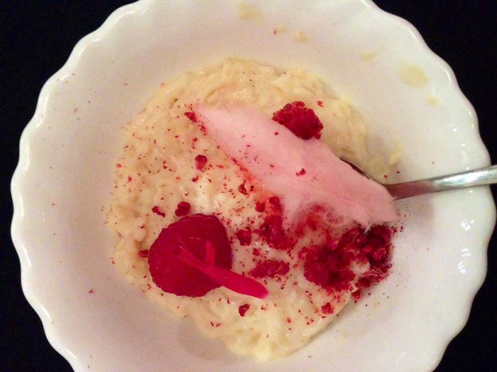 My favourite dish of the evening followed. And even though I’m not one to have to end a meal (or 6 course dinner!) with a sweet this one did it for me. Rice pudding, enticingly referred to as Risotto de Arroz con leche with a twist, was a seductively sublime dish. As it arrived at the table my immediate thoughts were that it was very pretty with its pink decorations and fruit – absolutely beautiful.