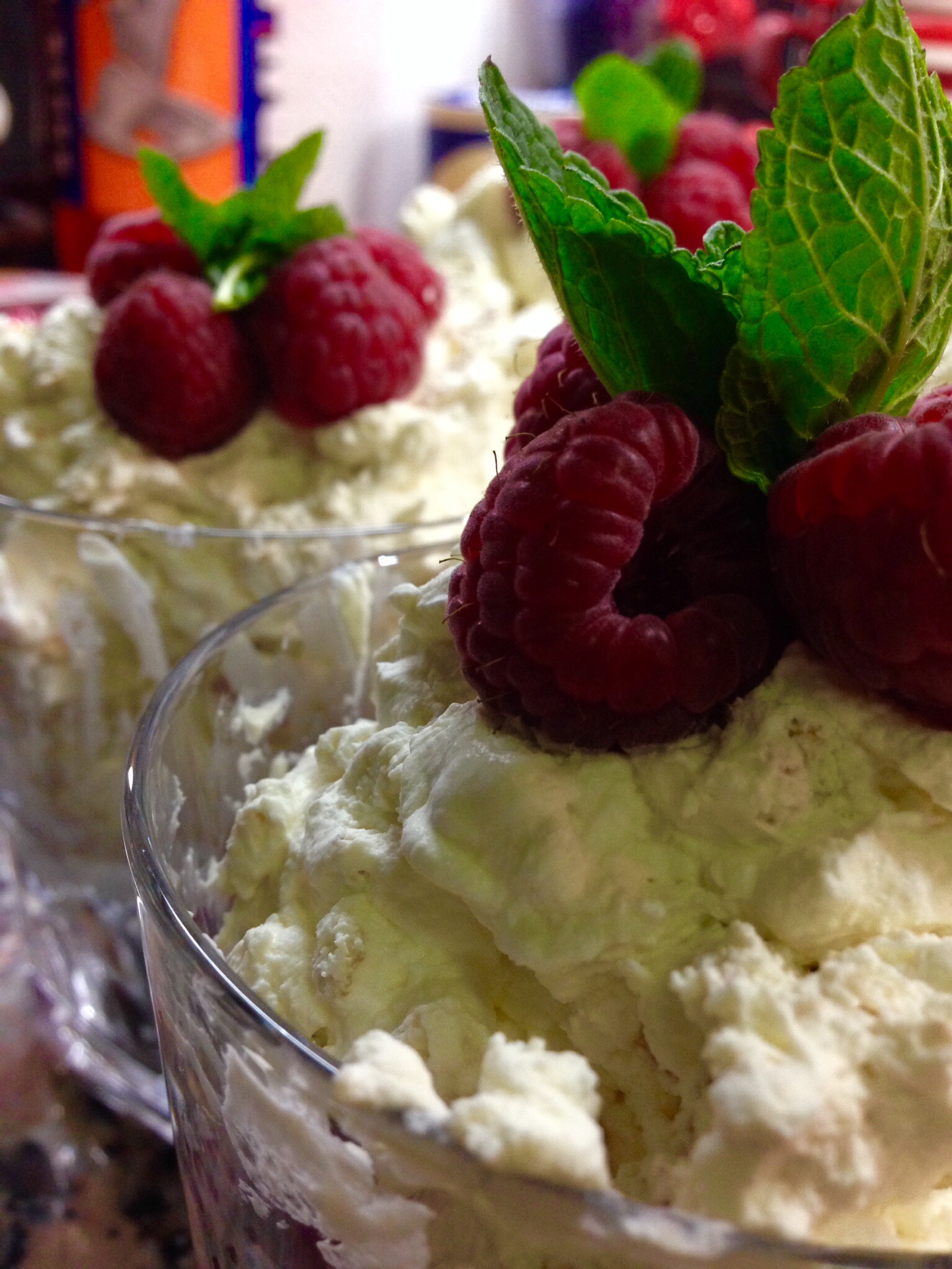 3./ In glasses assemble layers of the cream mixture with the raspberry purée and the raspberries. Serve with a sprig of mint.