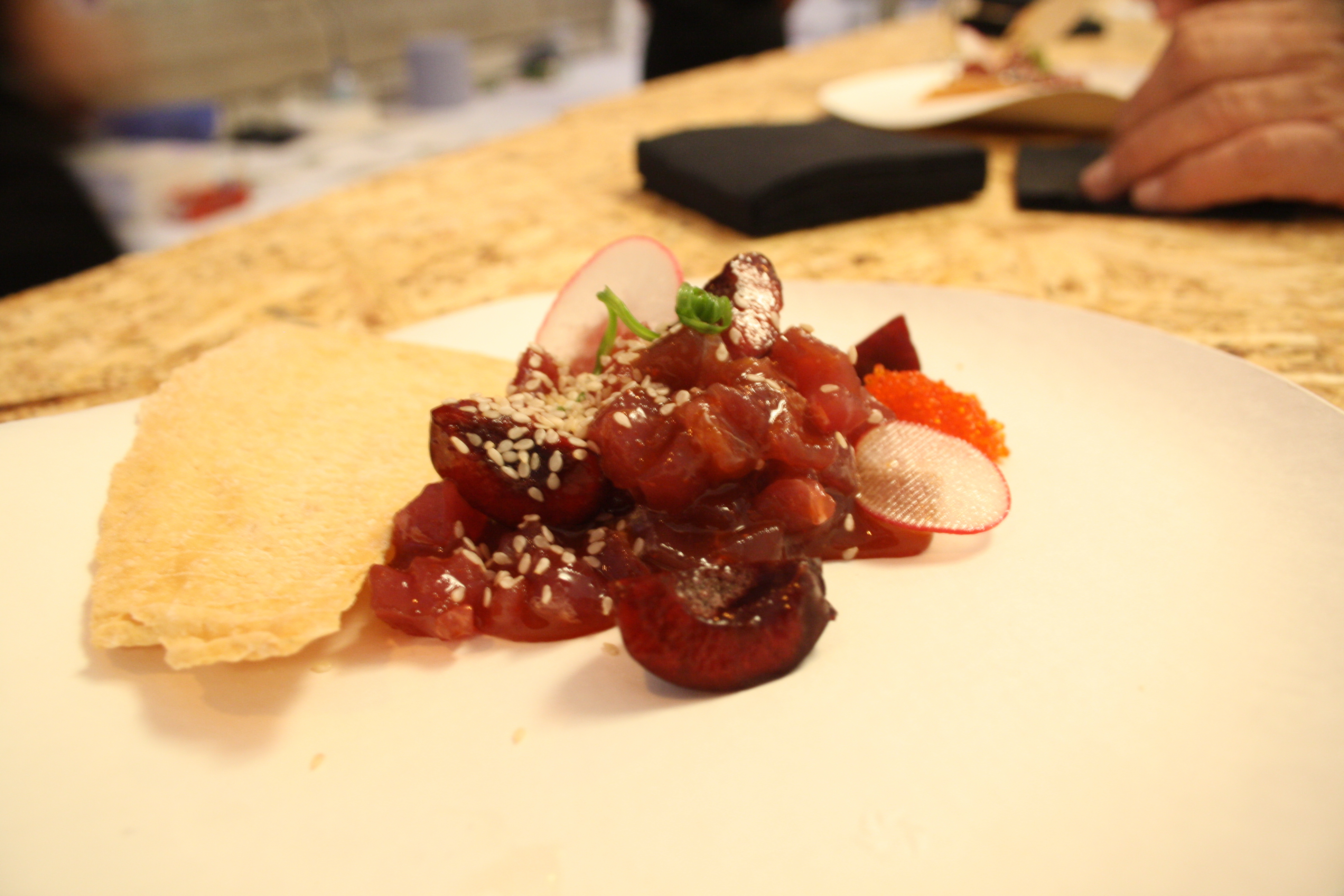 SANGRIA – as Chef Lede called it, “Sangria Solida”. A few cubes of sangria were served on ice and topped with zest of lime. How was the sangria solidified and kept from melting I hear you ask? Chef Lede infused watermelon cubes with homemade sangria. The cubes were easy to bite into – they had the texture of watermelon and the sangria taste was clearly present – with a dash of spirits here and there and brought to life with the lime zest – dangerously refreshing!