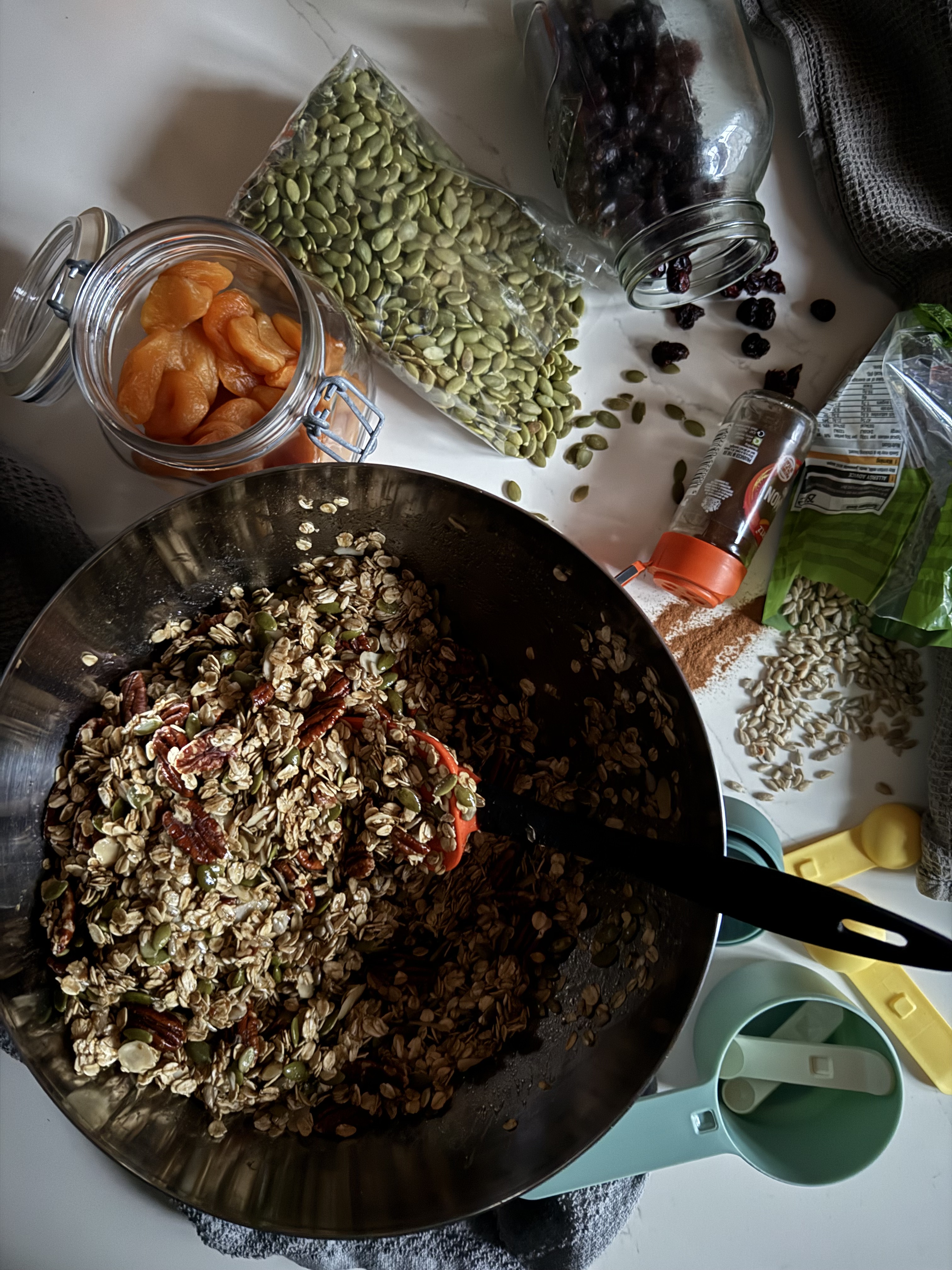 | 4 cups of rolled oats NOT porridge oats 1/2 cup vegetable oil 1/4 cup honey 1/4 cup maple syrup 1 tsp vanilla extract 1 tsp salt 1 tsp cinnamon | 1 cup pecan nuts 1/2 cup pumpkin seeds 1/2 cup sunflower seeds 1 cup dried cranberries 1/2 cup dried apricots |