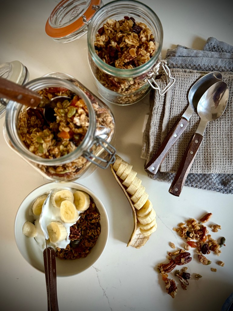 As mentioned above, my breakfast of choice is now homemade granola, greek yoghurt or kefir and fruit. Before you decide that you’re going to go with a box of granola picked off a shelf, I can say that shop-bought is not as healthy for us as we are made to believe it is. You’ll know exactly what you’re putting into your homemade granola, plus, it is very simple to make. It’s really just playing with cups, stirring a bowl and putting a tray in the oven.
